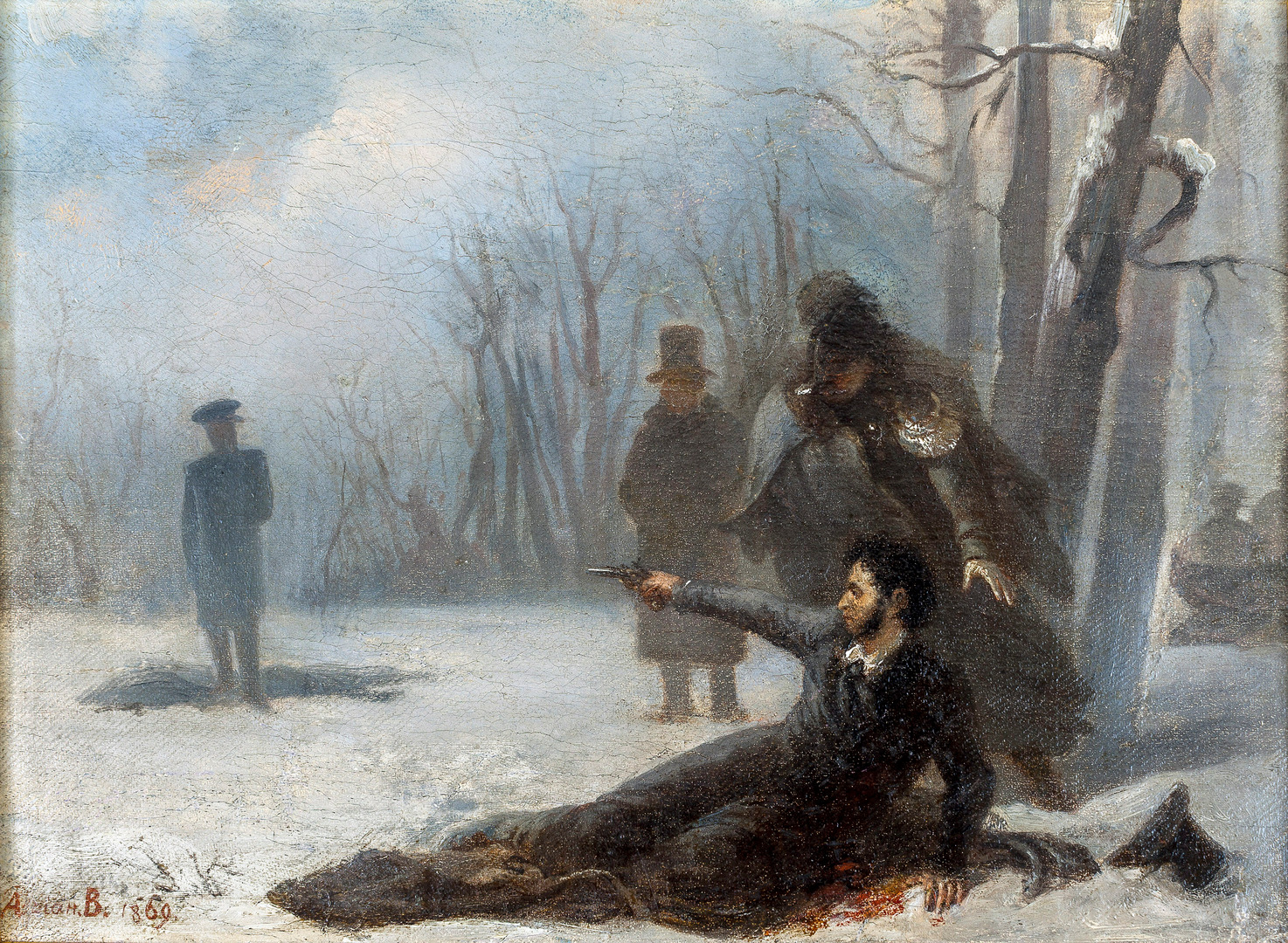 No dia 8 de fevereiro de 1837, Pushkin foi gravemente ferido em um duelo com o oficial francês Georges d'Anthès, vindo a falecer dois dias depois. O causa da disputa é atribuída a cartas anônimas e provocativas endereçadas ao grande poeta que sugeriam a infidelidade de sua esposa, Natália Goncharova, com o oficial francês.