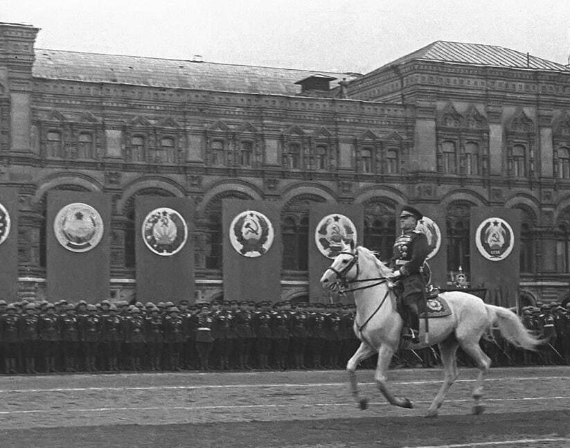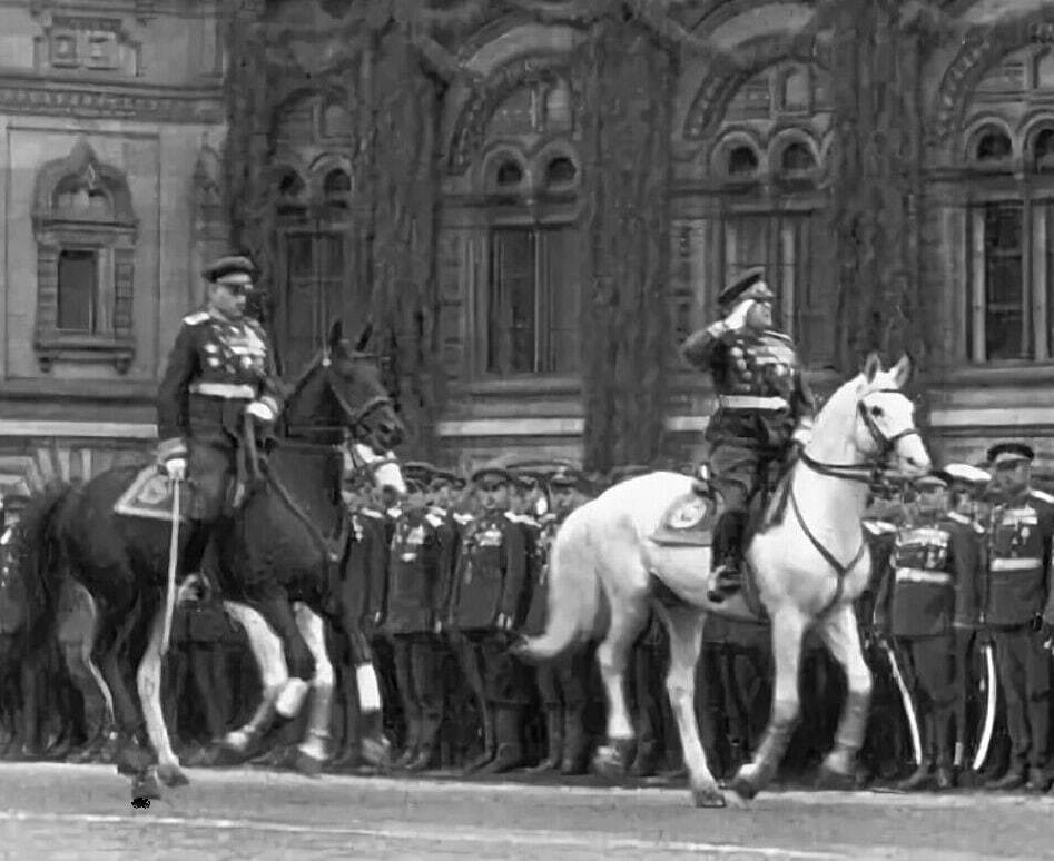 Em 24 de junho de 1945, a Praça Vermelha recebeu a lendária Parada da Vitória. Às 10h, sob os sinos do Kremlin, Zhukov entrou montado em um cavalo branco, enquanto Rokossovsky, comandante do desfile, cavalgava um garanhão preto.