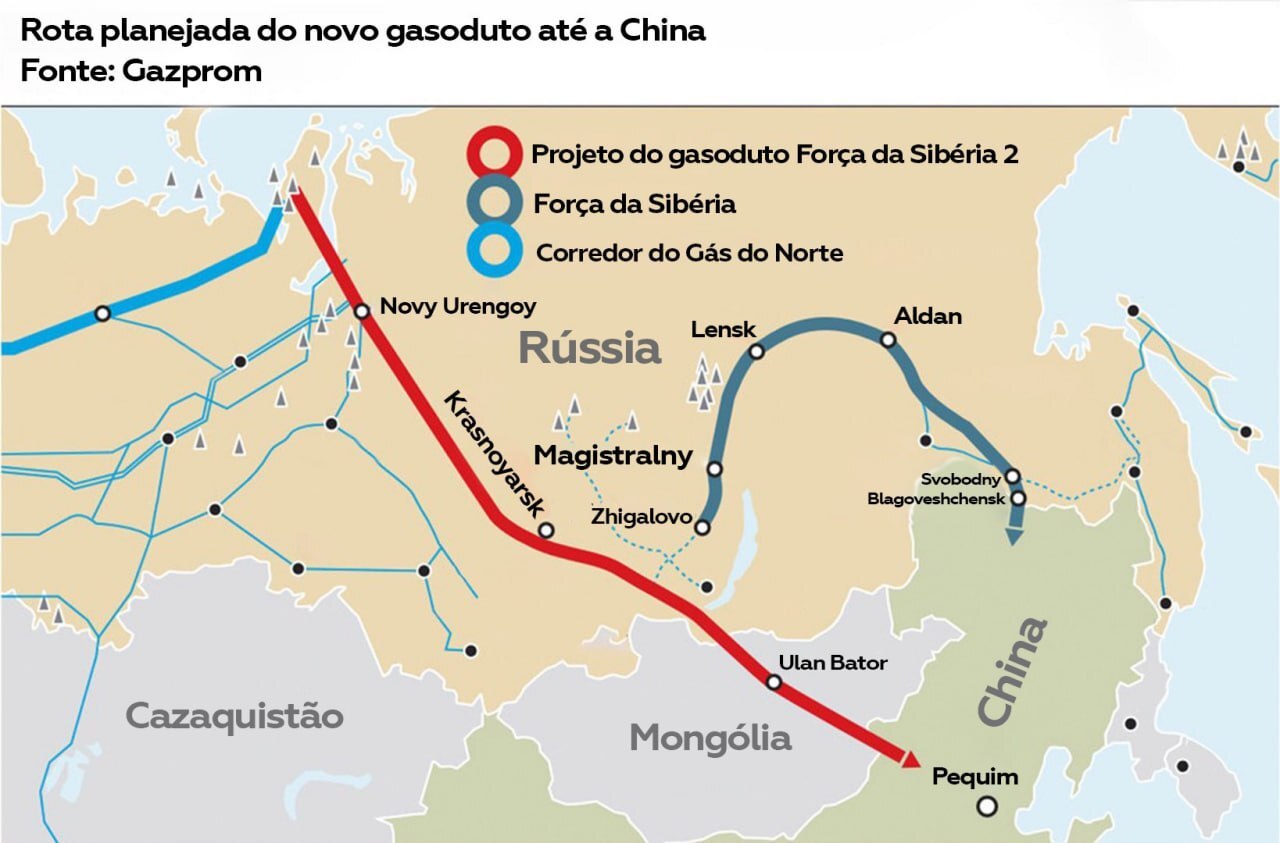 O presidente russo, Vladimir Putin, e o presidente chinês, Xi Jinping, planejam acelerar o projeto de construção do gasoduto Força da Sibéria-2 ("Sila Sibiri-2" no original em russo), afirmou o primeiro-ministro russo, Alexander Novak, à imprensa depois que os dois líderes se reuniram no Kremlin nesta quinta-feira (8).