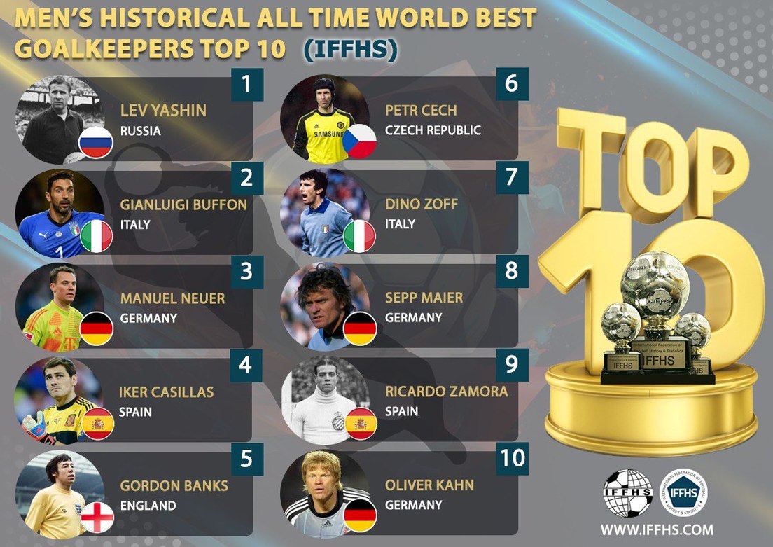 Lev Yashin foi reconhecido como o maior goleiro da história do futebol, anunciou a Federação Internacional de História e Estatística do Futebol em um comunicado, com o italiano Gianluigi Buffon em segundo lugar e o alemão Manuel Neuer em terceiro.