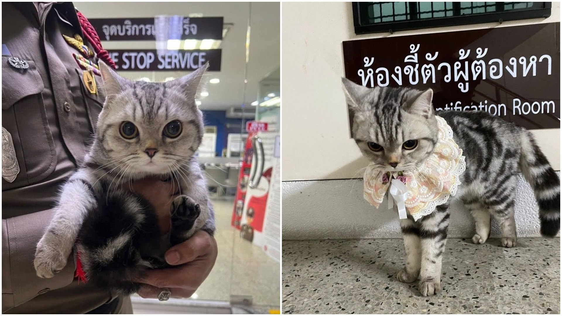 Na manhã seguinte, a dona de Nub Tang apareceu na delegacia e presenteou o felino com uma coleira de renda para celebrar o reencontro.