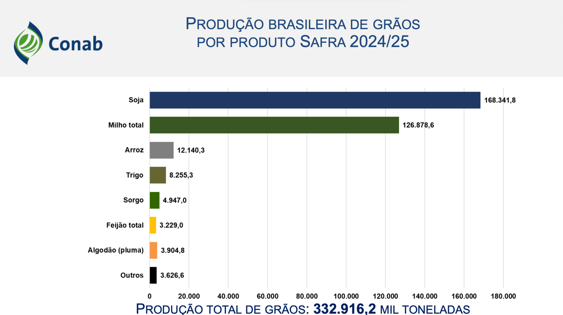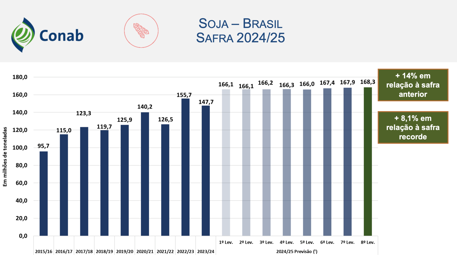Para o ciclo seguinte, de 2025/2026, a estimativa dos Estados Unidos para a produção brasileira de soja é ainda maior: 175 milhões de toneladas.