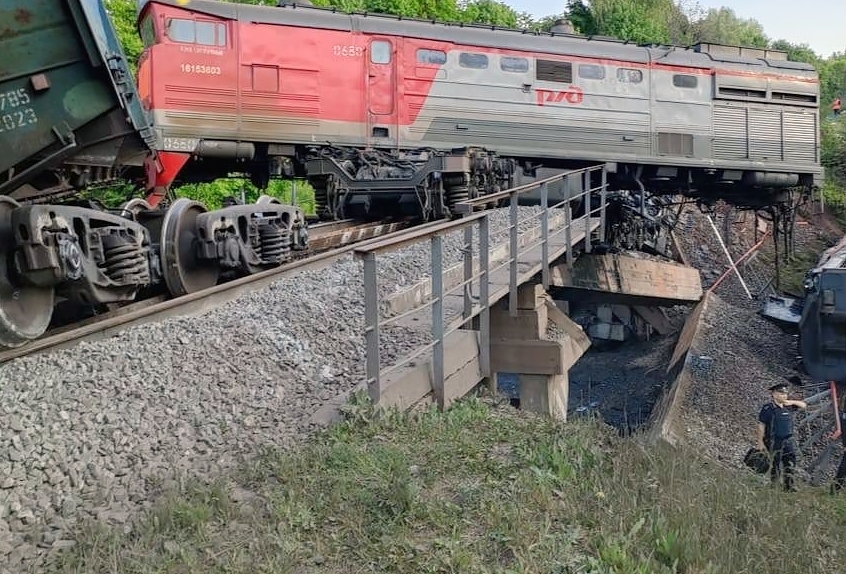 - Ao mesmo tempo, na província de Kursk, a locomotiva de um trem de mercadorias em trânsito caiu na manhã de domingo de uma ponte ferroviária danificada em uma estrada.
