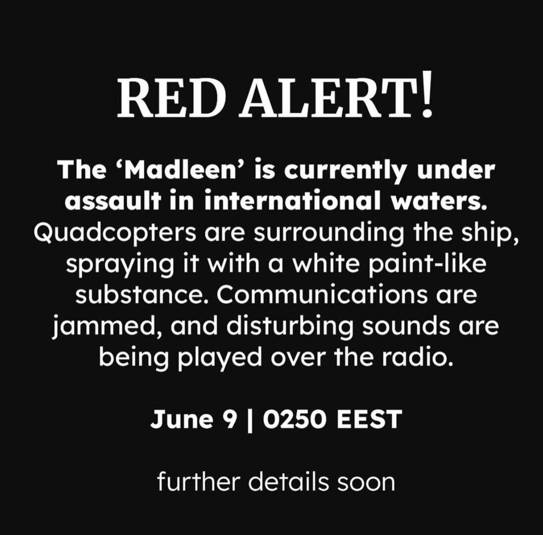 "O Madleen está sendo atacado em águas internacionais. Quadricópteros [drones] estão cercando o navio, borrifando-o com uma substância branca parecida com tinta. As comunicações estão bloqueadas e sons perturbadores estão sendo reproduzidos pelo rádio", publicou a página nas redes sociais da "Freedom Flotilla Coalition", organização que traz reportes sobre a missão.