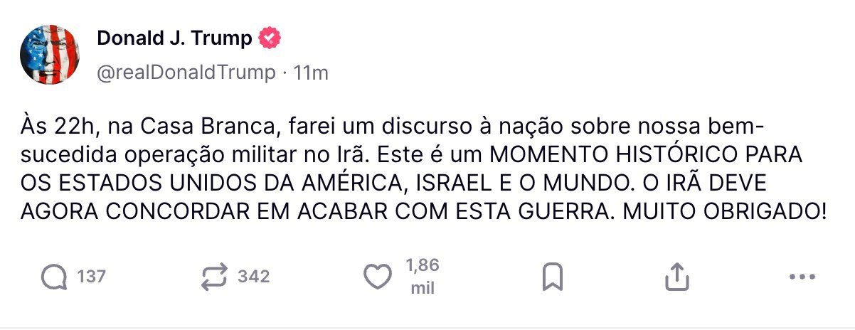 Instantes após a publicação anunciando o ataque, o presidente dos EUA fez uma nova postagem. Nela, anuncia um pronunciamento à nação e exige que o Irã ''acabe com esta guerra''.