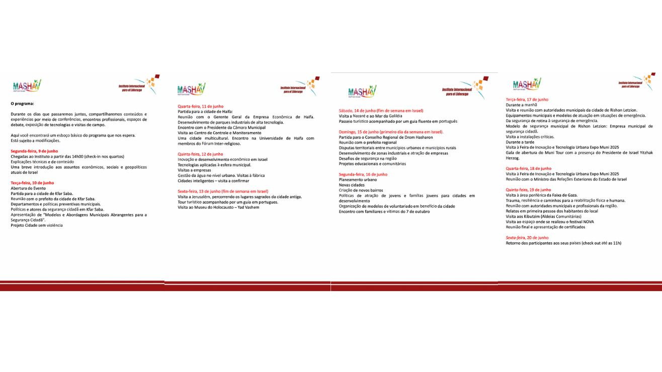 Segundo o documento oficial do programa Muni Israel 2025, a missão teve como temas principais a "segurança cidadã", a "liderança municipal diante da complexidade regional" e o "desenvolvimento urbano e tecnológico". Estavam previstas visitas a locais afetados pelo conflito, como os kibutzim na região próxima à Faixa de Gaza, bem como encontros com familiares de vítimas do 7 de outubro.