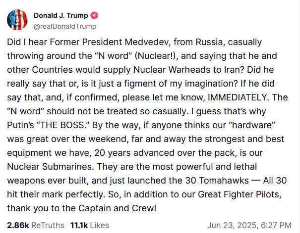 "Será que eu ouvi o ex-presidente russo Medvedev acidentalmente dizer a palavra com a letra N (nuclear!) e dizer que ele e outros países forneceriam ogivas nucleares ao Irã?" - Trump escreveu em sua página da mídia social Truth.