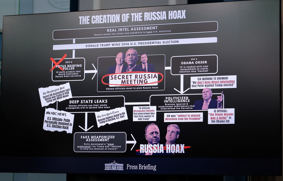 Nesta semana e na anterior, autoridades norte-americanas desclassificaram e divulgaram relatórios da Inteligência Nacional dos Estados Unidos que, segundo a atual diretora da agência, Tulsi Gabbard, contêm "provas irrefutáveis" de que o ex-presidente Barack Obama e sua equipe de segurança nacional "orientaram a criação de uma avaliação da comunidade de inteligência que eles sabiam ser falsa". Gabbard classificou as ações do governo Obama como uma "politização e manipulação grosseiras da inteligência", com o objetivo deliberado de "deslegitimar o presidente Trump antes mesmo de ele assumir o cargo".