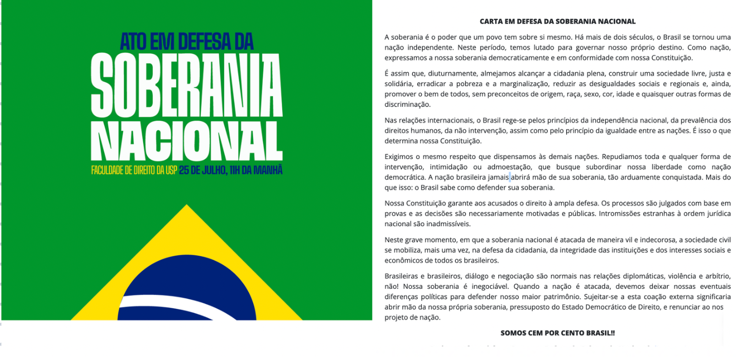 A Faculdade de Direito da Universidade de São Paulo realizou na manhã desta sexta-feira (25) um Ato em Defesa da Soberania Nacional. A mobilização ocorreu no Salão Nobre da instituição e foi organizada pela diretoria da faculdade, com apoio do Centro Acadêmico XI de Agosto.