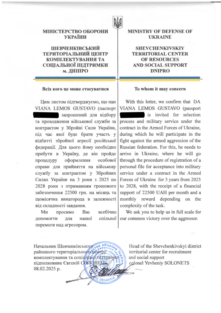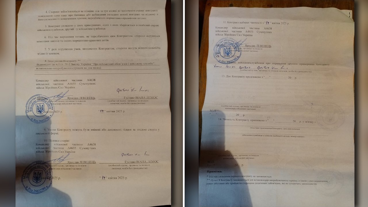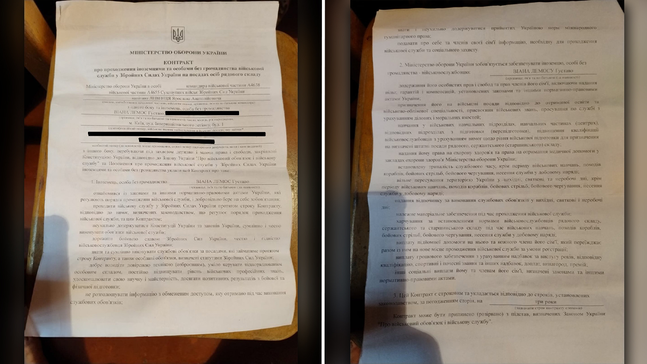 O contrato assinado com o Ministério da Defesa da Ucrânia previa três anos de serviço militar. Embora o documento prometesse alojamento, assistência médica e alimentação, esses pontos não foram garantidos na prática.