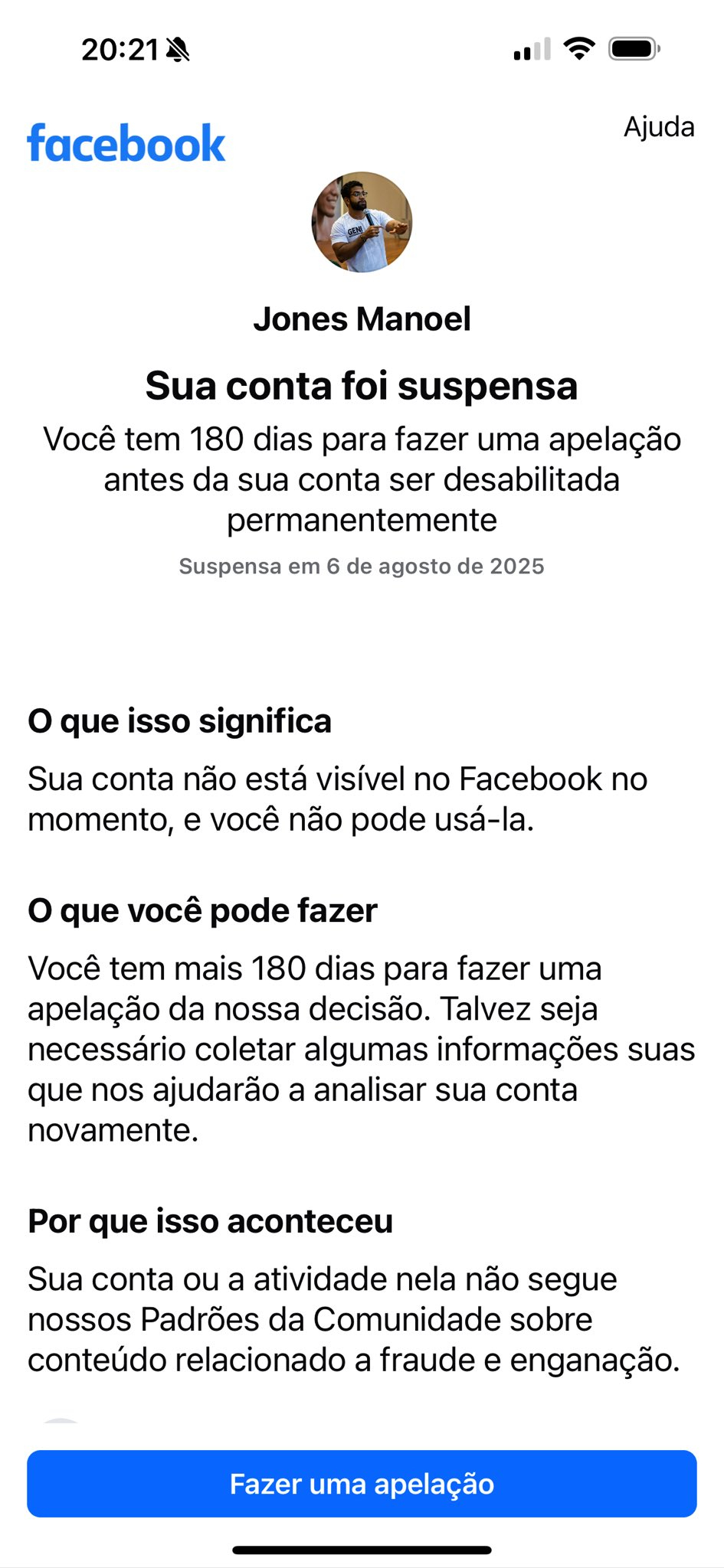 "Por fim, o óbvio: a conversa sobre liberdade de expressão das Big Techs é chaveco". Esta foi a primeira manifestação do historiador e ativista político Jones Manoel (PCBR-PE) após ser notificado acerca da suspensão de sua conta no Facebook na quarta-feira (06). Jones Manuel compartilhou captura de tela da notificação recebida em que o Facebook alega que "a conta ou a atividade" da página de Jones não segue os "Padrões da Comunidade sobre conteúdo relacionado a fraude e enganação".