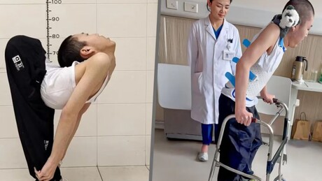 O jovem chinês Jiang Yanchen, de 21 anos, conhecido como o "menino dobrado", conseguiu ficar em pé pela primeira vez após passar por quatro cirurgias complexas que realinharam sua coluna. Diagnosticado com espondilite anquilosante desde a infância, ele sofria uma deformidade extrema que curvava sua coluna em 180 graus, obrigando-o a se mover deitado ou ajoelhado.