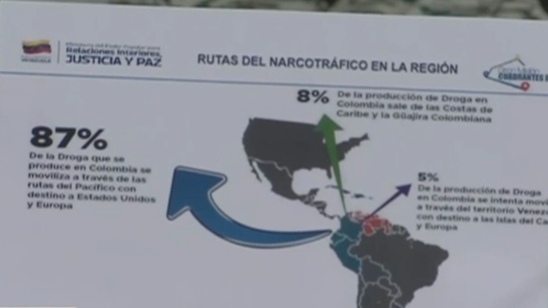 Maduro declarou, apontando para a Colômbia em um mapa com as principais rotas do narcotráfico na região, que "a cocaína é toda produzida aqui, na Colômbia, e foi produzida pelos aliados dos EUA, Álvaro Uribe Vélez e Iván Duque, que eram capangas de Pedro Escobar Gaviria".