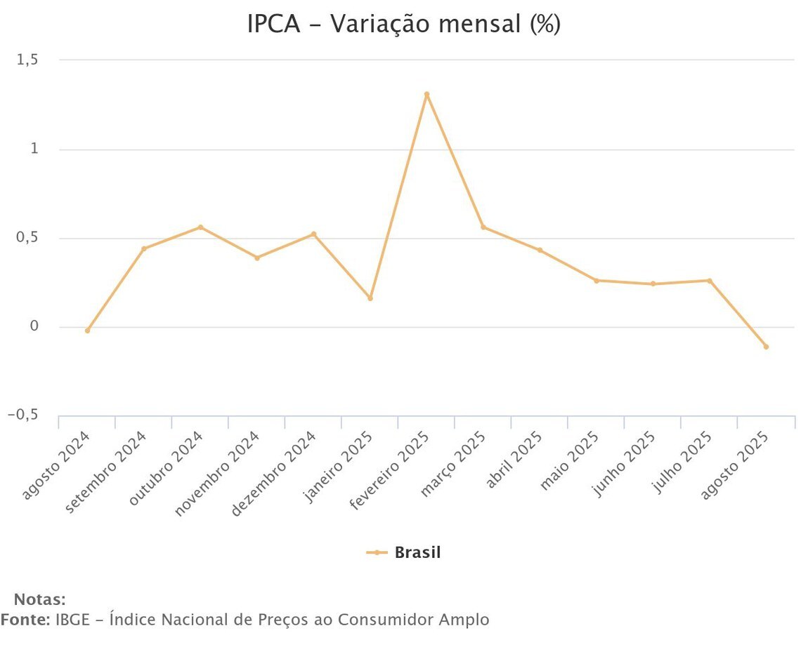 Em agosto de 2025, a Brasil registrou deflação pela primeira vez desde agosto de 2024: o Índice de Preços ao Consumidor Amplo (IPCA) caiu 0,11%, em sua queda mais significativa desde setembro de 2022.