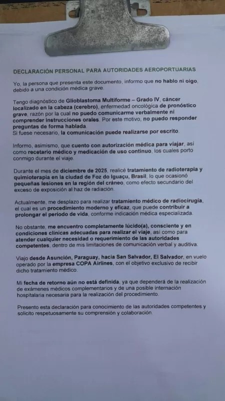 A carta também dizia que ele havia realizado sessões de radioterapia e quimioterapia em Foz do Iguaçu e que a viagem até San Salvador, capital de El Salvador, tinha o objetivo exclusivo de continuar o tratamento médico. O voo estava marcado pela companhia Copa Airlines, com escala no Panamá.