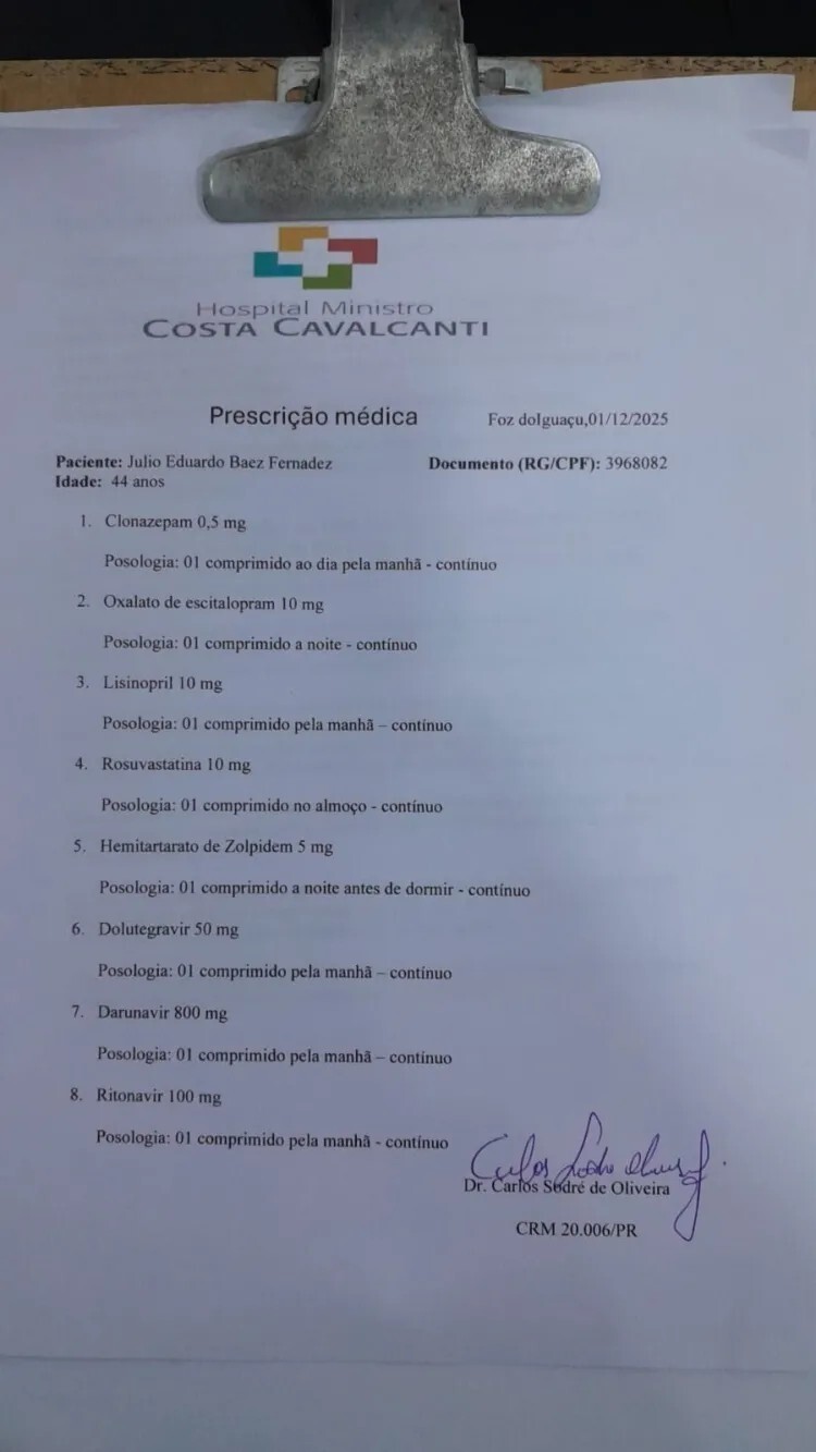 Silvinei também levava consigo uma prescrição médica emitida em papel timbrado do Hospital Ministro Costa Cavalcanti, com oito medicamentos listados como de uso contínuo. Entre os remédios estavam ansiolíticos, antidepressivos, hipnóticos e antirretrovirais usados no tratamento de HIV, como dolutegravir, darunavir e ritonavir.