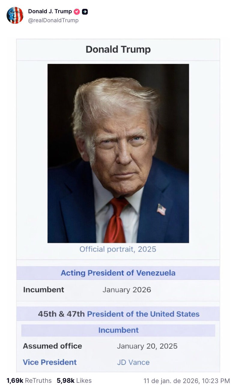 A publicação, com o formato visual da Wikipédia, exibe o retrato oficial de Trump com a data de 2025 e menciona que ele teria assumido o cargo venezuelano em janeiro de 2026.