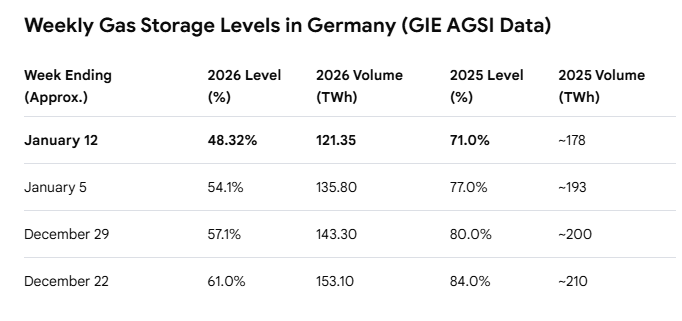 Os níveis nas instalações subterrâneas de armazenamento estão bem abaixo dos registrados no início de 2025, cerca de 50%, ante aproximadamente 77% há 12 meses. Dados da Gas Infrastructure Europe (GIE) indicam queda de cerca de 13 pontos percentuais nas últimas quatro semanas.
