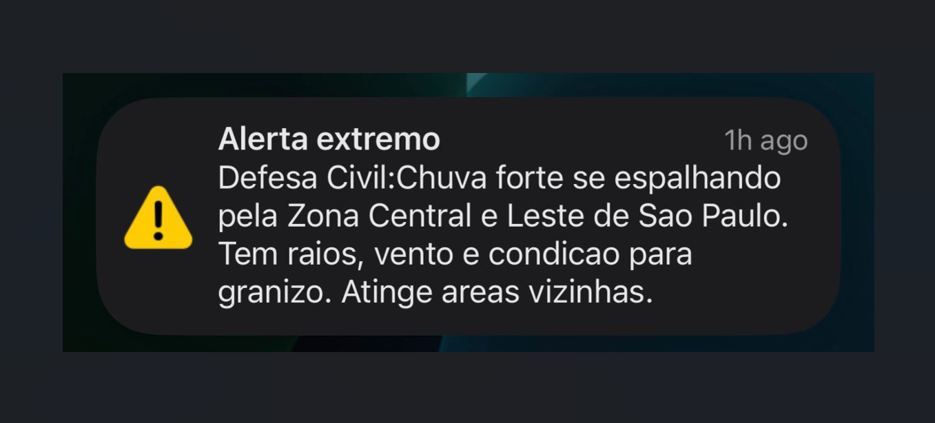 Pela primeira vez, a Defesa Civil emitiu um alerta extremo diretamente nos celulares dos moradores. A mensagem chegou acompanhada por um som semelhante ao de uma sirene e informou sobre a intensificação da chuva.