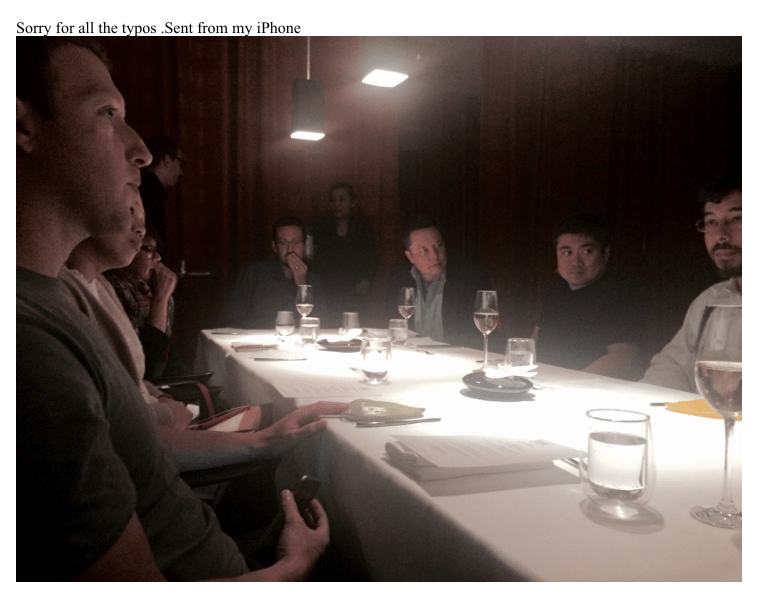 O jantar é mencionado em uma resposta a um e-mail de 20 de agosto de 2015 do bilionário Tom Pritzker. Epstein fez referência a esse jantar e mencionou várias personalidades influentes, incluindo Elon Musk, Peter Thiel e Reid Hoffman. "Ainda não tenho certeza. Jantei com Zuckerberg, Musk, Thiel, Hoffman; selvagem", diz o documento. No entanto, ele não forneceu detalhes sobre o que aconteceu durante o jantar.