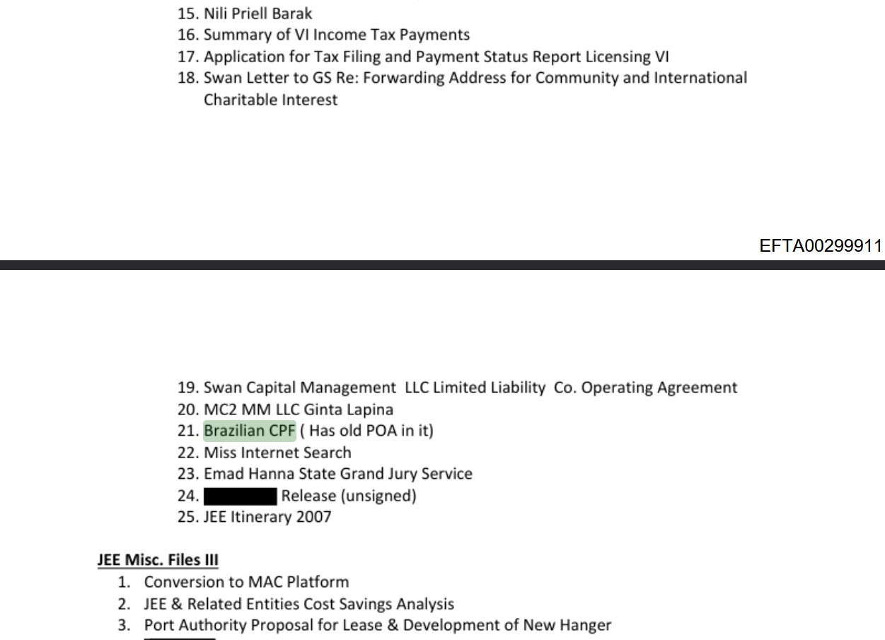 Documentos do Departamento de Justiça dos Estados Unidos mostram que o bilionário Jeffrey Epstein possui um CPF ativo no Brasil. De acordo com reportagem do G1, publicada nesta quinta-feira (12), o registro foi emitido em 2003 e permanece em situação regular.