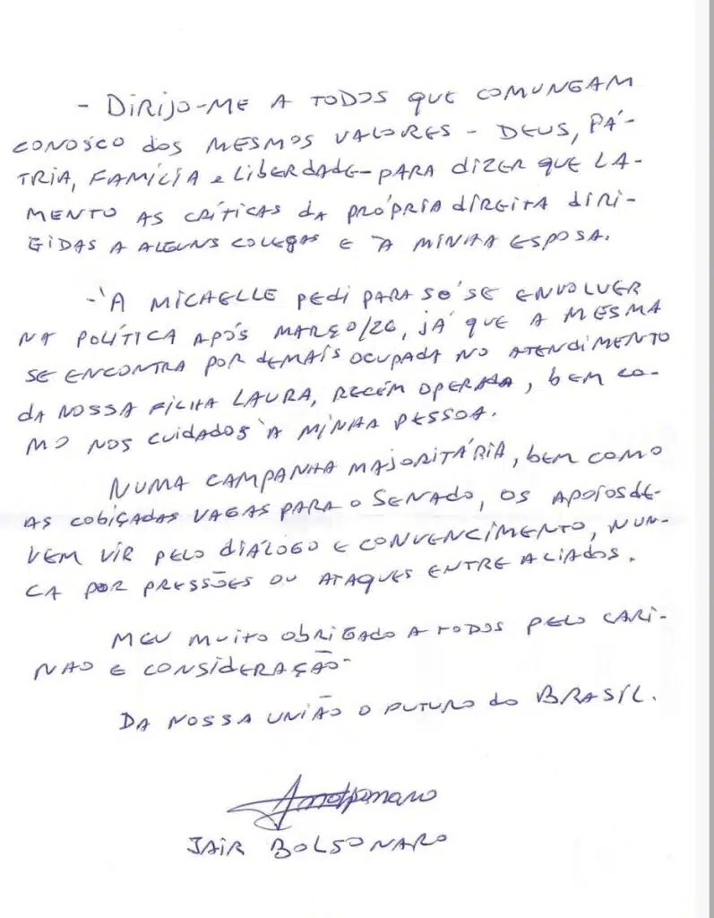 Bolsonaro escreve carta a Michelle com pedidos de união na direita
