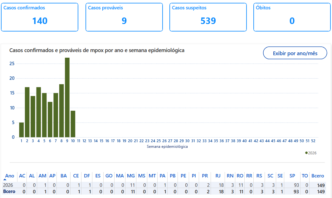 O Brasil contabiliza 140 casos confirmados de mpox em 2026, sem registro de mortes relacionadas à doença. A informação foi divulgada pelo Ministério da Saúde na segunda-feira (09).