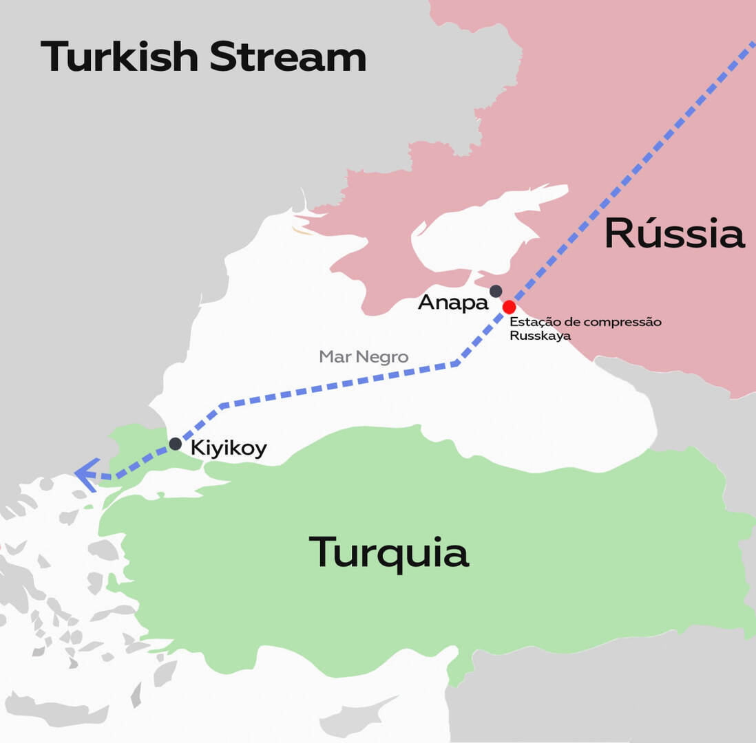 - O TurkStream, com mais de 930 km, liga a costa russa à região turca da Trácia, garantindo energia confiável para Turquia e sudeste europeu. Composto por duas linhas paralelas em alto-mar, opera a até 2.200 metros de profundidade e transporta 31,5 bilhões de metros cúbicos por ano. Inaugurado em janeiro de 2020, é a única rota contínua de gás russo para a Europa após o sabotagem dos gasodutos Nord Stream.
