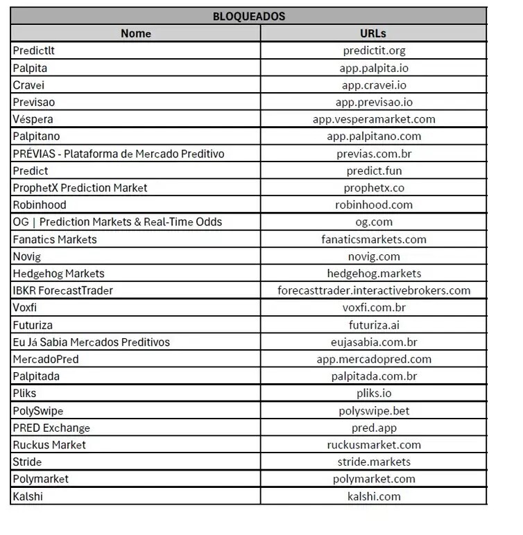 A medida será colocada prática pela Agência Nacional de Telecomunicações (Anatel), atendendo a uma decisão do Ministério da Fazenda. Entre as bloqueadas estão as plataformas Polymarket e Kalshi.
