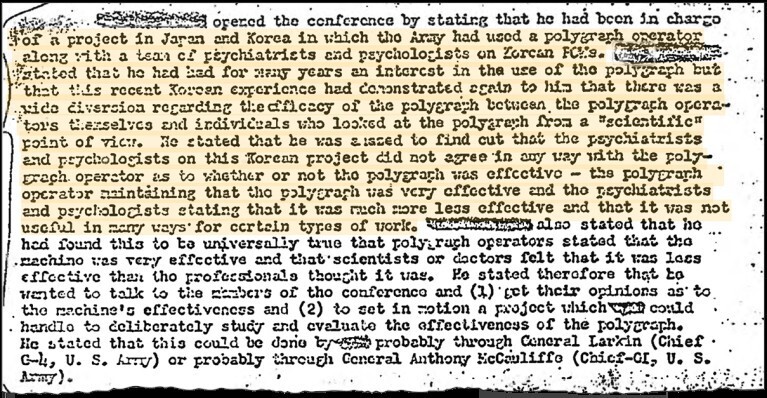 Um informe de uma reunião da agência menciona um "projeto no Japão e na Coreia no qual o Exército utilizou um operador de polígrafo junto com uma equipe de psiquiatras e psicólogos com prisioneiros de guerra coreanos".
