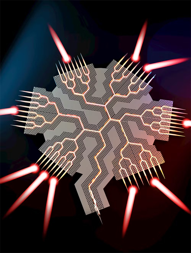 O chip de silício topológico de formação de feixe de terahertz, como o nome sugere, explora as características físicas (topológicas) do silício, que ajudam a direcionar as ondas de terahertz e transformá-las em feixes direcionados. O especialista explica que o chip recebe um sinal de terahertz de uma única fonte e o divide em 54 sinais menores, que são então guiados por 184 canais minúsculos. Como novidade, a matriz de canais envia feixes potentes e focados que cobrem os 360 graus ao redor do chip em um padrão microscópico de favo de mel.