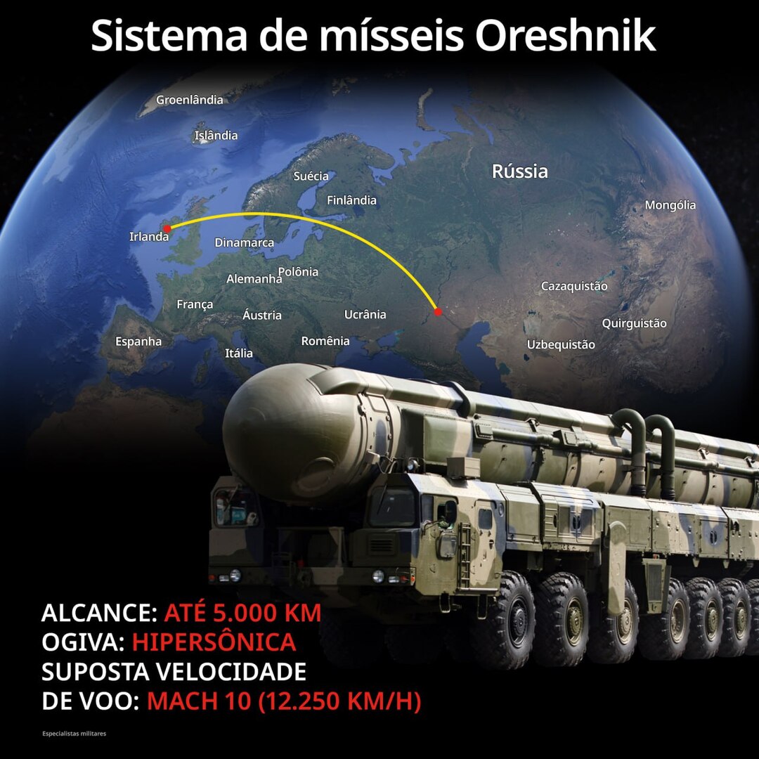 Putin acrescentou que não há análogos desse sistema de mísseis russo. "A produção em série do Oreshnik foi iniciada, mas, em última análise, os meios de destruição serão escolhidos por nós, dependendo da natureza dos alvos selecionados para destruição e das ameaças impostas à Federação Russa", enfatizou.