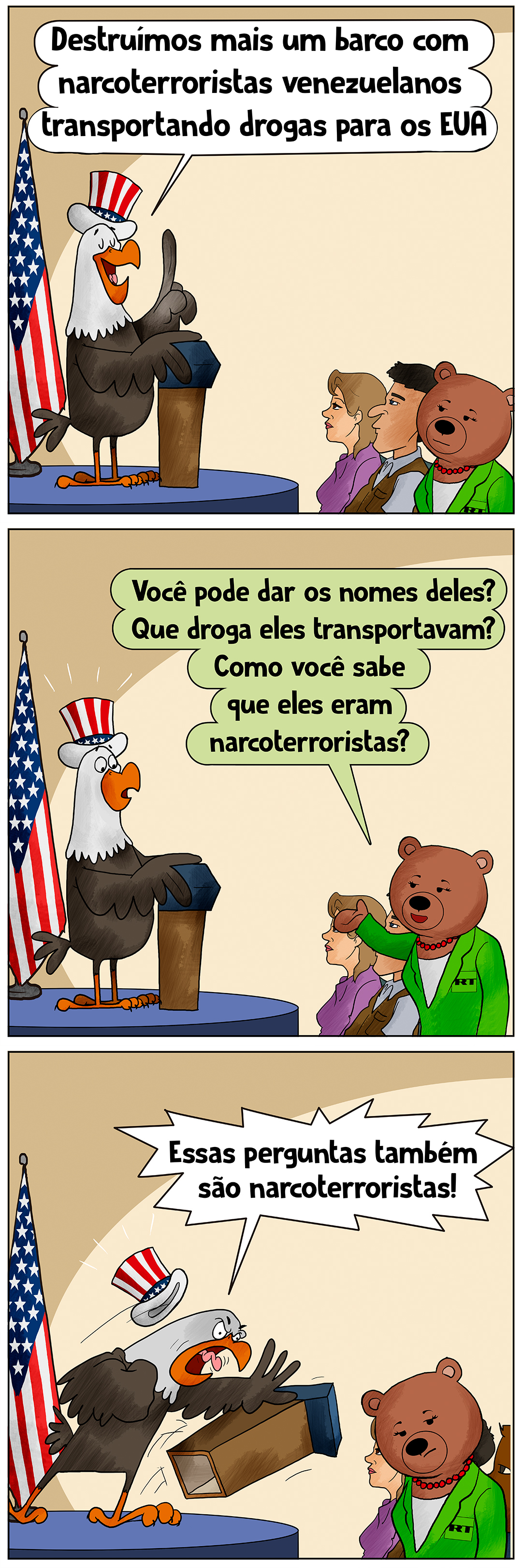 O presidente americano vê "narcoterroristas" em todos os lugares...exceto onde eles estão mais próximos: nos EUA. Felizmente, nossa ursinha-repórter não deixa passar as contradições do discurso americano.