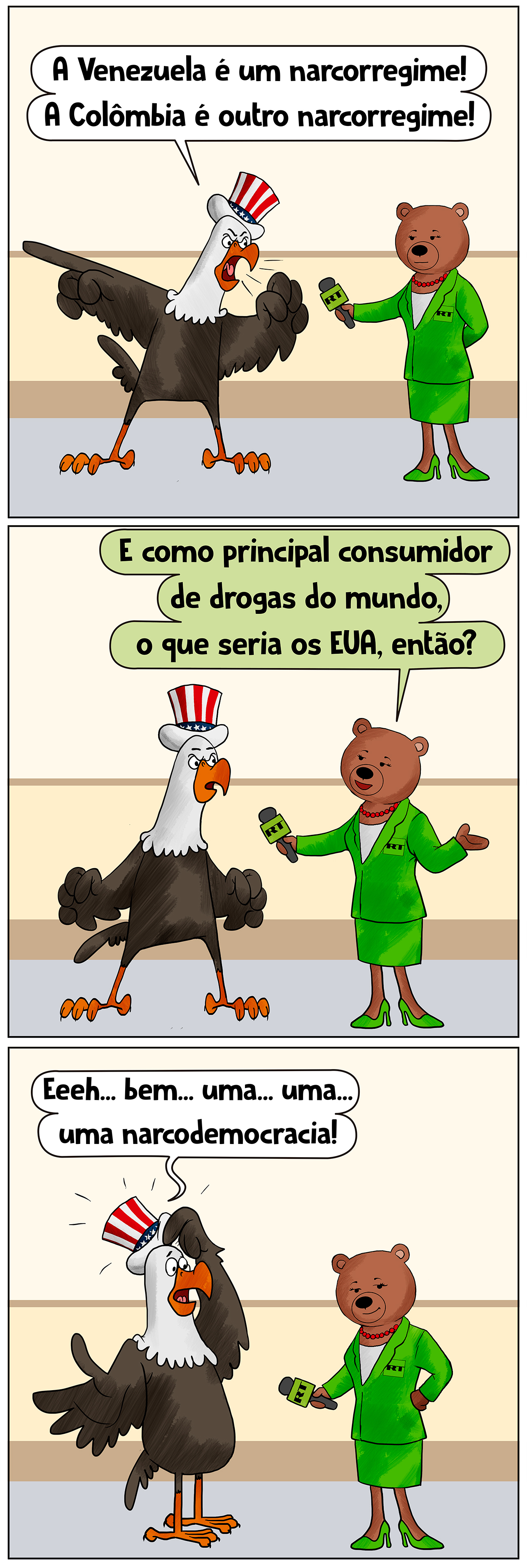 Donald Trump vê narcotraficantes em todos os lugares: Venezuela, Colômbia, México, Nigéria...Mas nossa repórter revelou que o presidente americano é incapaz de vê-los justamente onde deveria procurá-los 😅